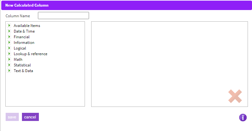 - Click on a function from the Function List to add it to the Formula Build Area. Functions are grouped into sections such as Date & Time and Financial which can be expanded to show the relevant functions within.