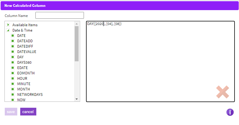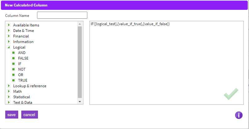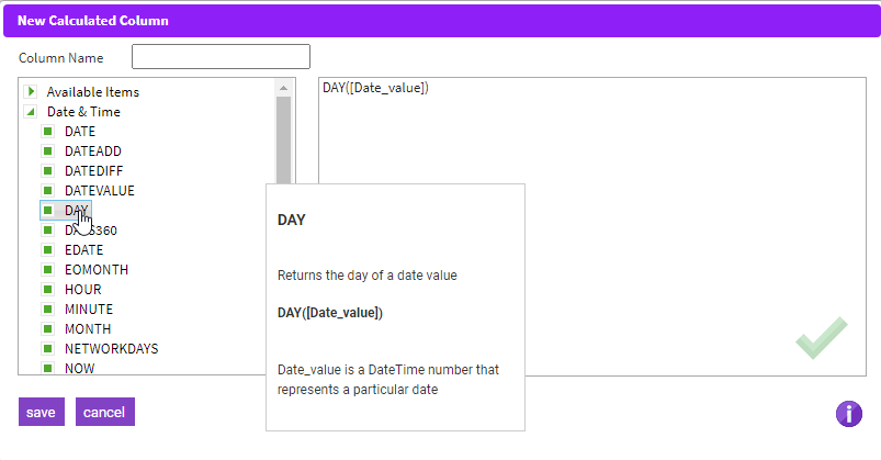 Note: The formula will be continually checked for validity while it is within the Formula Build Area, providing access to the Save button when valid.