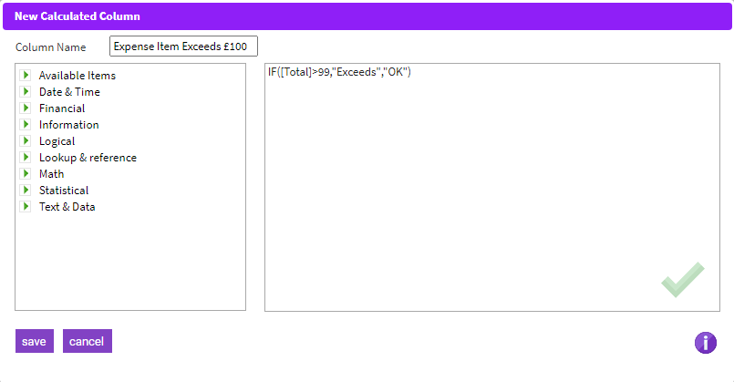 - [value_if_false] - Replace [value_if_false] with the text that you want to appear if the Expense Item does not exceed £99. This example displays "OK".