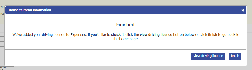 7. Return to Assure Expenses which will confirm that the consent process is finished. You can then either view driving licence or finish the process and return to Assure Expenses.