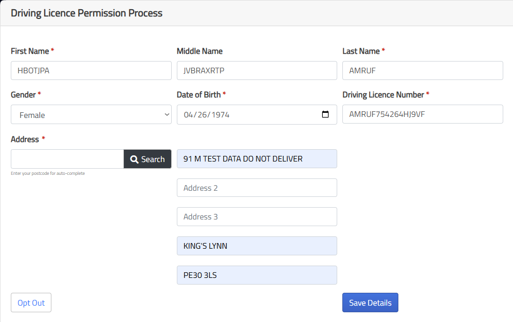 5. If this is the first time giving consent, you will be directed to the 'Driving Licence Permission Process' form within the consent portal where you will be required to enter the following details: