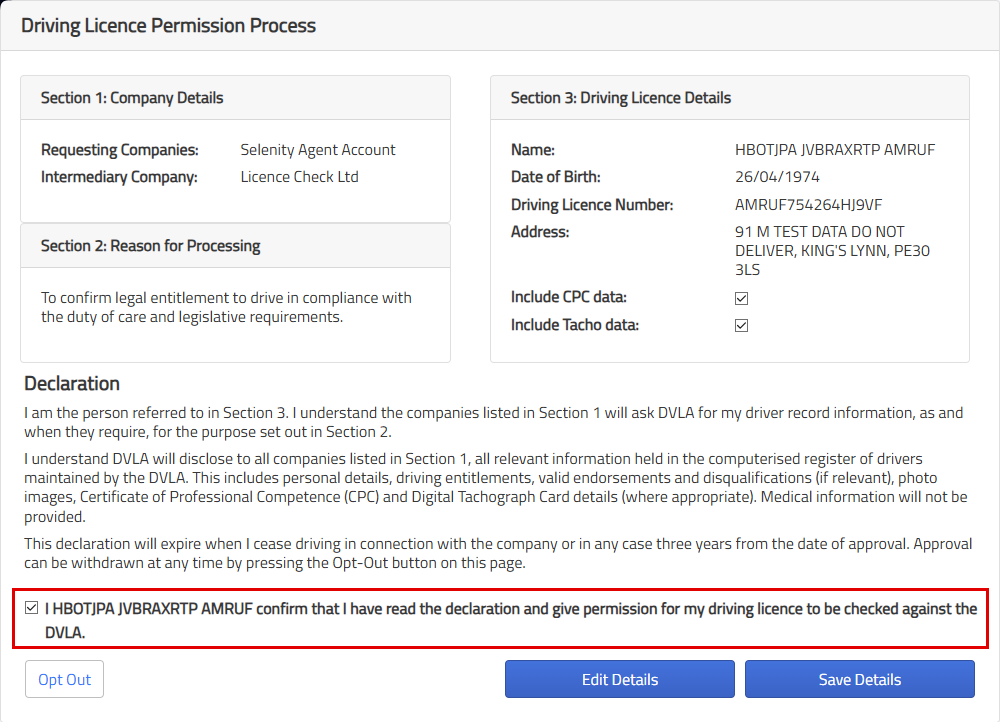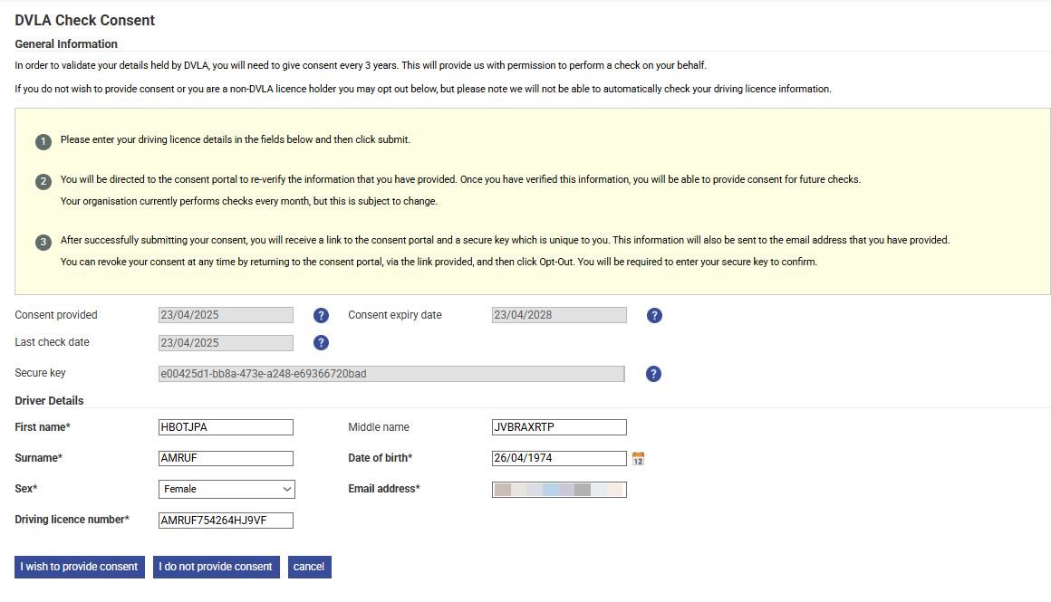 2. The DVLA Check Consent page will display the 'Driver Details' section which you will be required to complete in order to provide consent. This will include the following fields: