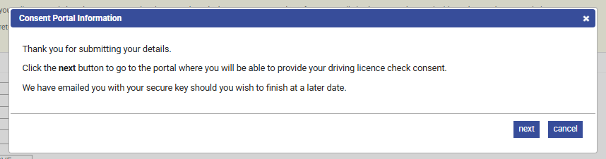 4. Your details will be submitted to 'Licence Check' and a confirmation window will appear. Click next to be redirected the portal where you will be able to provide your consent.