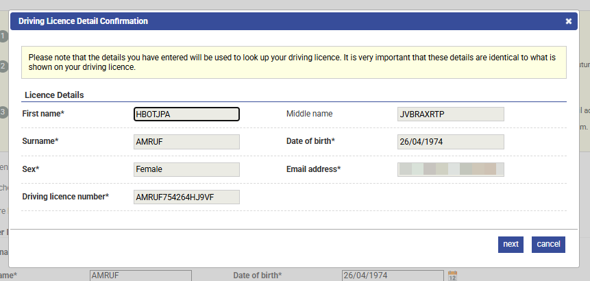 A window will appear confirming the details that you have entered. Ensure that these details are identical to what is shown on your driving licence and then click next.